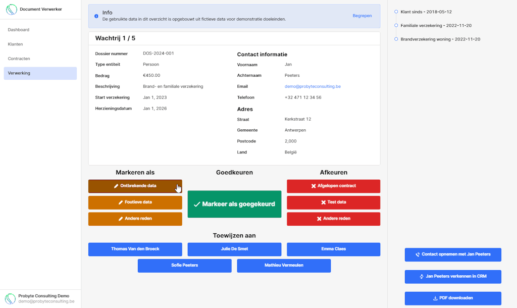 - Nauwkeurigheid en betrouwbaarheid: Automatische validatie verkleint de kans op fouten aanzienlijk. Contracten worden gecontroleerd op consistentie, correcte data zodat klanten altijd de juiste informatie ontvangen.