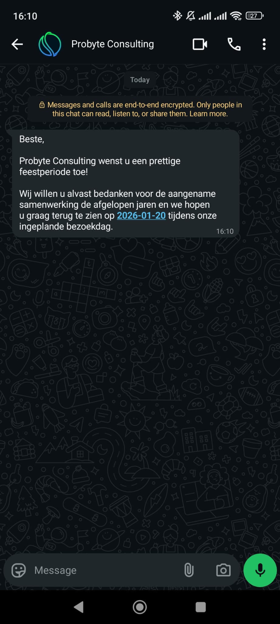 Dankzij platformen zoals Twilio kunnen we WhatsApp-berichten volledig geautomatiseerd versturen. Dit maakt de oplossing schaalbaar, efficiënt en flexibel inzetbaar voor verschillende use cases en niet alleen voor eindejaarswensen, maar ook voor het opvragen van documenten, bevestigen van contracten, of gerichte campagnes over nieuwe producten. Het resultaat is een moderne, persoonlijke communicatie die zowel voor de makelaar als voor de klant een duidelijke meerwaarde biedt.